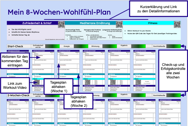 Am Anfang des Programms werden die Ziele festgelegt (ganz unten) der Status in den Check-up Balken festgehalten. Immer nach 2 Wochen wird der Fortschritt neu überprüft und dokumentiert. Das hält Dich während des Weges motiviert.