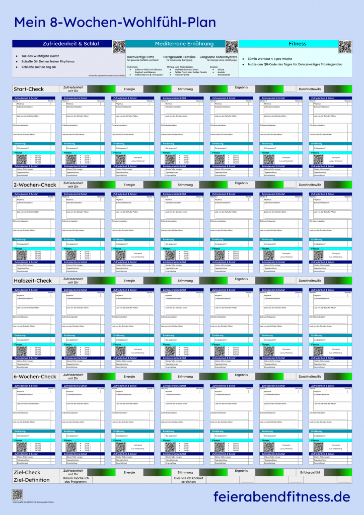 Für jeden Tag des Programms enthält das Poster einen Block mit den Aufgaben für den jeweiligen Tag zum Abhaken. Darin findet sich zudem der Link zum Workout-Video für diesen Tag. Das macht es einfach, dem Programm zu folgen.